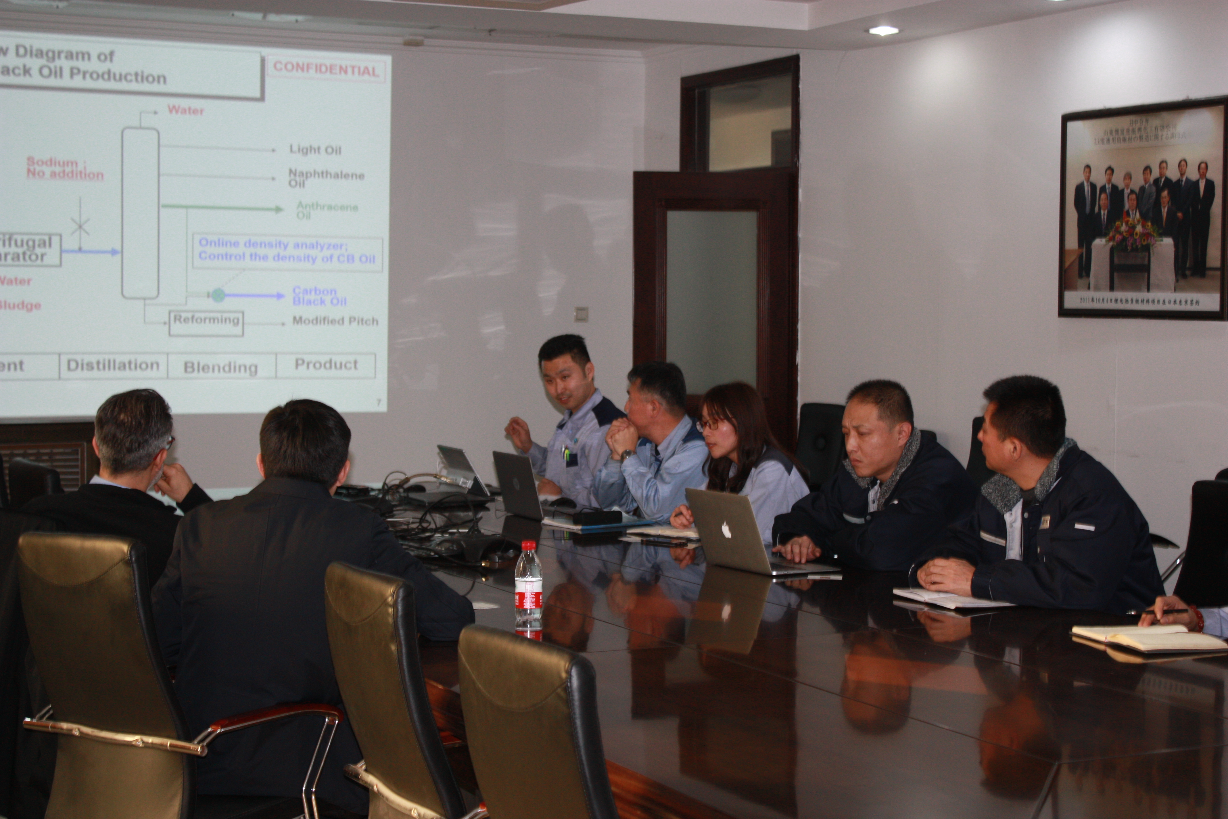 Cottrell Todd一行首先在會(huì)議室進(jìn)行座談,詳細(xì)了解杰富意公司基本情況,主導(dǎo)產(chǎn)品組成架構(gòu),焦油、炭黑油、蒽油等炭黑原料油的成分比例、數(shù)量等情況及后期炭黑的市場(chǎng)預(yù)測(cè)、炭黑原材料市場(chǎng)趨勢(shì)等。并依據(jù)山東杰富意公司和棗莊杰富意公司實(shí)際制定了較為詳細(xì)的國(guó)內(nèi)炭黑油和蒽油的銷售方案,對(duì)蒽油出口印度博拉工廠的設(shè)想達(dá)成了共識(shí)。隨后,Cottrell Todd一行到現(xiàn)場(chǎng)進(jìn)行了實(shí)地參觀,對(duì)炭黑油、蒽油的質(zhì)量把控、庫(kù)存量、裝車設(shè)施、計(jì)量設(shè)施進(jìn)行詳細(xì)了解,對(duì)企業(yè)的發(fā)展給予認(rèn)可。博拉炭黑方表示,作為老客戶將在2020年建立更加穩(wěn)固的戰(zhàn)略合作關(guān)系。
