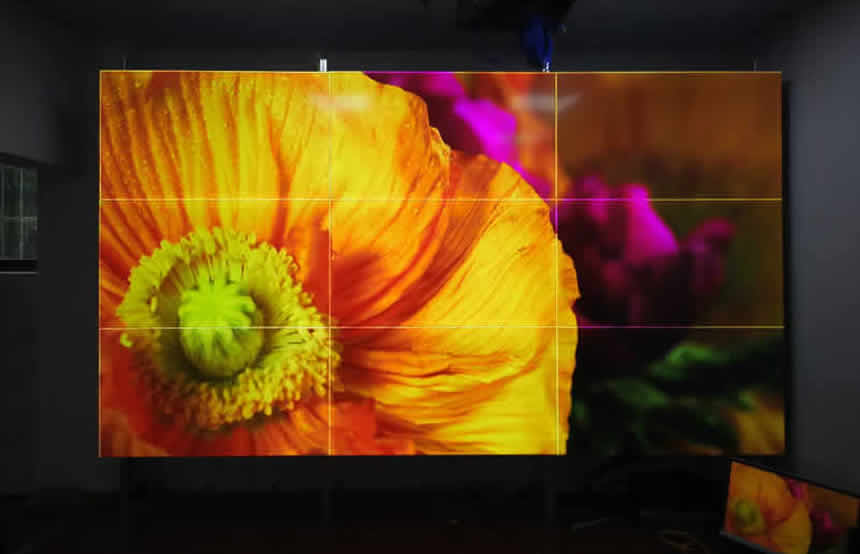 利用LED補償技術(shù)雖然使拼接單元之間實現(xiàn)融合顯示,但在亮度和色差的統(tǒng)一性上還是略有差別,所以在靜態(tài)畫面顯示時候拼接部分的亮度與色差沒有達到完整的顯示,但也基本不會影響觀看。如下圖: